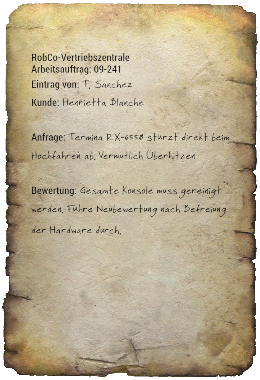 Die Notiz liegt im Keller der RobCo-Vertriebszentrale neben einem beleuchteten, defekten Terminal.
