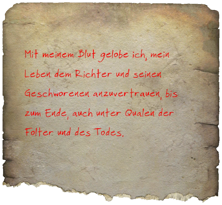 Mit meinem Blut gelobe ich, mein Leben dem Richter und seinen Geschworenen anzuvertrauen, bis zum Ende, auch unter Qualen der Folter und des Todes.