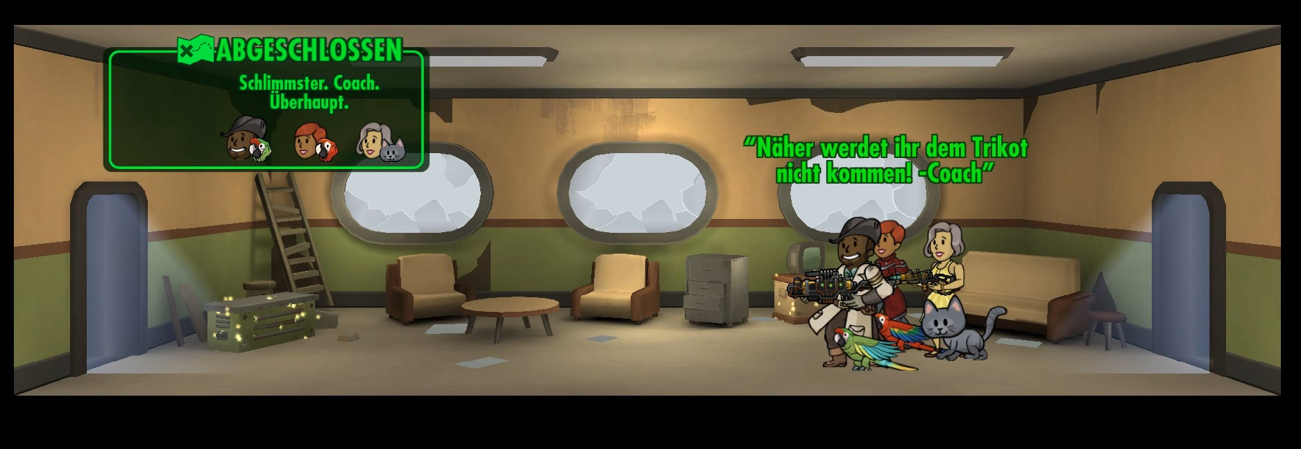 | Diese Datei stammt aus dem Video-Spiel Fallout Shelter oder von Webseiten, die von Bethesda Softworks erstellt wurden und deren Urheberrechte bei Bethesda Softworks liegen, oder wurde von dieser für Werbezwecke an die Presse abgegeben. Alle im Bild enthaltenen Marken und eingetragenen Marken sind Eigentum von Bethesda Softworks. Es wird davon ausgegangen, dass die Verwendung der Bilder zur Illustration von Artikeln, die das Thema der fraglichen Bilder betreffen, als faire Verwendung im Sinne des US-amerikanischen Urheberrechtsgesetzes gilt, da eine solche Darstellung das Recht des Urheberrechtsinhabers zum Verkauf des urheberrechtlich geschützten Materials nicht wesentlich einschränkt und in diesem Zusammenhang nicht dazu verwendet wird, Gewinn zu erzielen. |