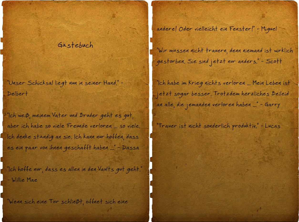 | Diese Datei wurde in dem Video-Spiel Fallout 76 aufgenommen oder stammt von Webseiten, die erstellt und im Besitz von Bethesda Softworks sind, deren Urheberrecht von Bethesda Softworks beansprucht wird. Alle im Bild vorhandenen Warenzeichen und eingetragenen Warenzeichen sind Eigentum von Bethesda Softworks. Die Verwendung von Bildern in Artikeln zur Veranschaulichung des Themas der fraglichen Bilder gilt nach dem US-amerikanischen Urheberrechtsgesetz als fair use, da eine solche Darstellung das Recht des Urheberrechtsinhabers, das urheberrechtlich geschützte Material zu verkaufen, nicht wesentlich beeinträchtigt und in diesem Zusammenhang nicht dazu verwendet wird, Gewinn zu erzielen. |
