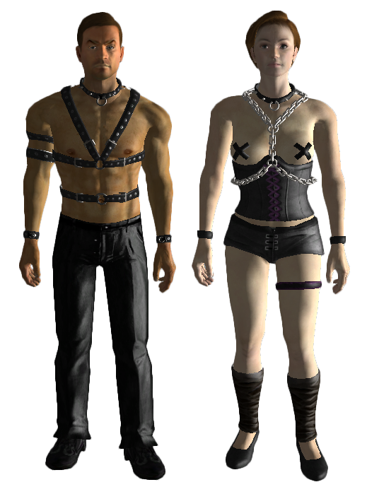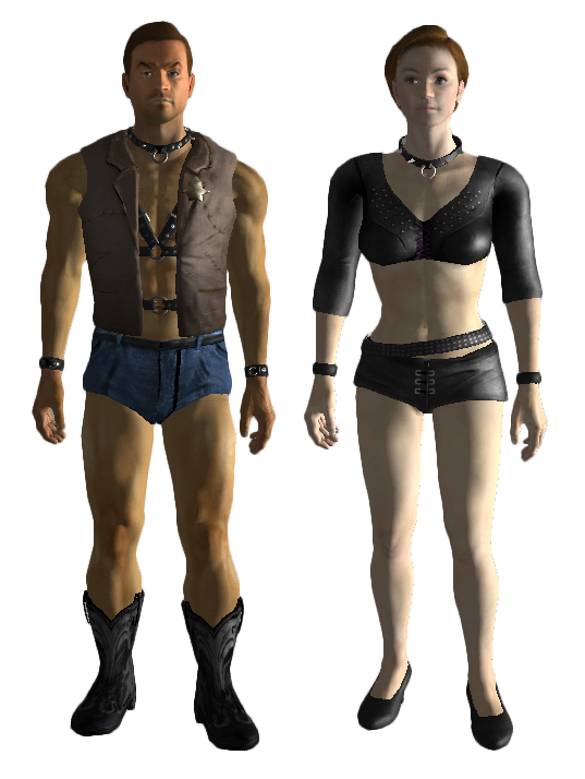 Es handelt sich um die Kleidung, die die Prostituierten in New Vegas als "Arbeitskelidung" tragen. Es gibt drei verschiedene Typen, die alle die Werte für die Schadensschwelle (0), das Gewicht (2) und den Wert (390) teilen. Sie lassen sich untereinander reparieren.